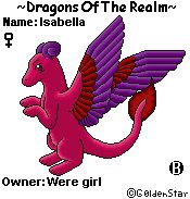 12th September 2004: we have a new member! a light dragon Called Isabella, Flame and Sekmet give up being Alphas and choose the new Alphas who are Evil Flame and Isabella!13th September 2004: Mordred grew up! biggrin