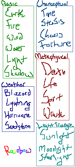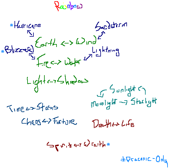 Confused? It's quite easy to get confused by all of the elements -- think of them all, each with an opposite, each set in something of a "tier," with one set being rarer than the next ... not to mention, some of these "tiers" are arranged in triangles, and some are arranged in hexadragons (just kidding!). Who could keep it all straight? No one without reference, that's for sure! So, for your convenience, Maru's decided to post a "map" of the elements that she just... err *cough*... found lying around in her office one day. Please excuse the messy handwriting! We're working with a mouse, here!